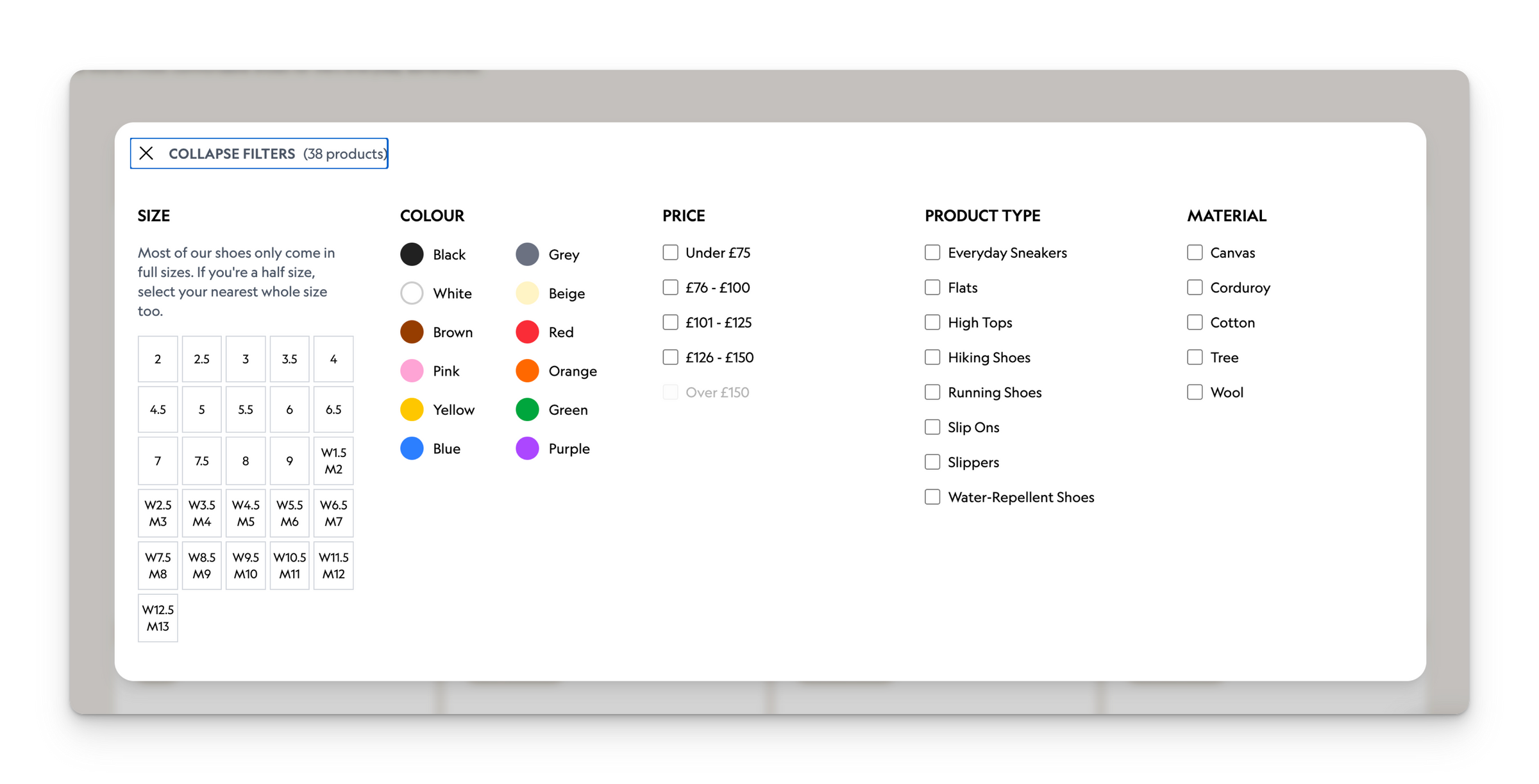 On the UK storefront, women’s shoes are grouped into categories such as Trainers, Flats, Boots, Slip-Ons, Active, and All-Weather. This structure mirrors how customers are likely to think about footwear when browsing: by type, use, and condition. Filters for product type, material, color, and price are surfaced early, reinforcing that mental model.